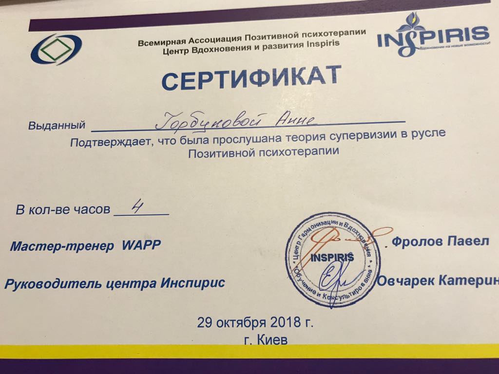 Сертификат о супервизии по методу Позитивная Психотерапия