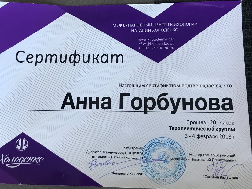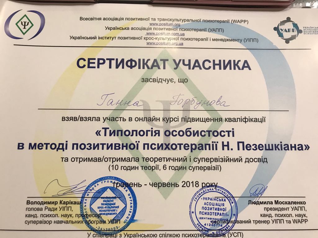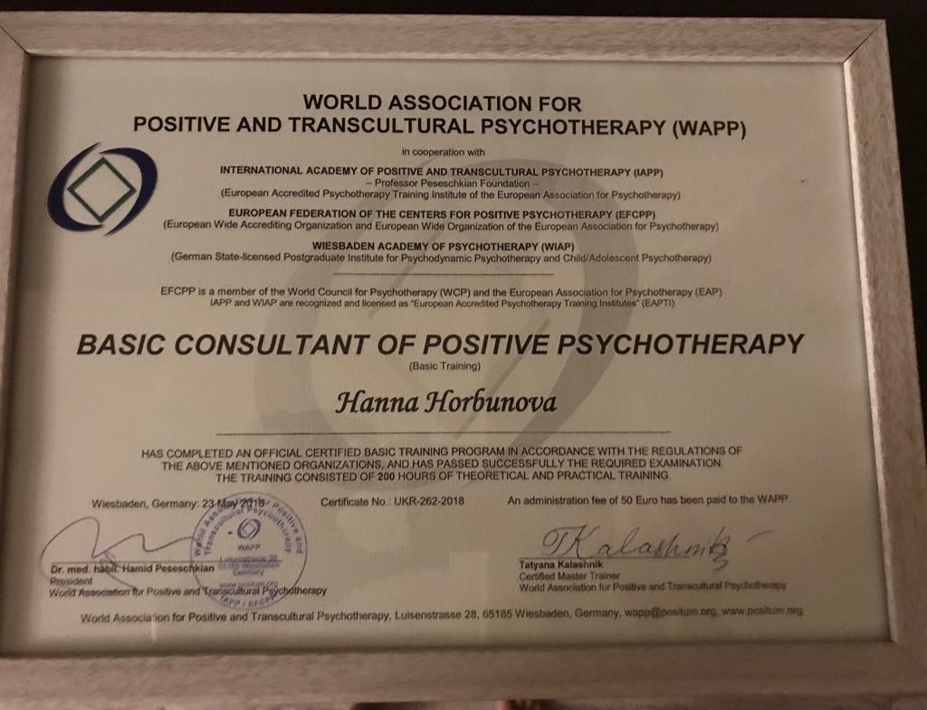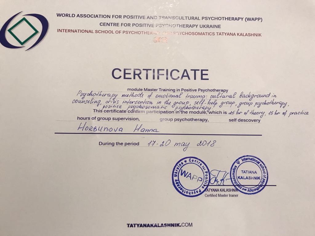 Сертификат о получении образования в методе Позитивная Психотерапия